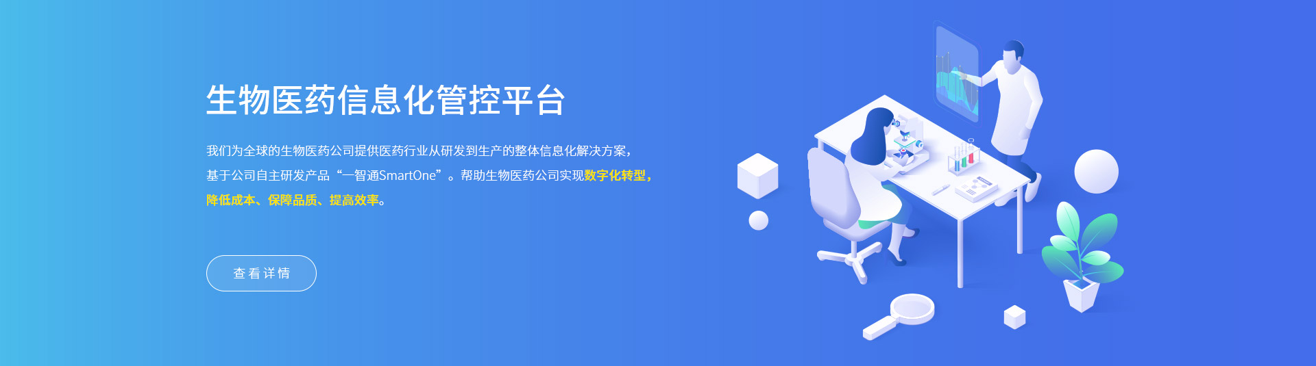 我們為全球的生物醫藥公司提供醫藥行業從研發到生產的整體信息化解決方案,基于公司自主研發產品“一智通SmartOne”。幫助生物醫藥公司實現數字化轉型,降低成本、保障品質、提高效率。
